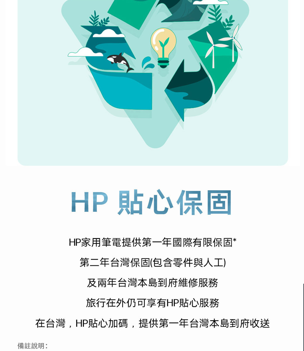 • 持續落實永續環保理念: 採用海洋回收塑料/再生金屬件/消費性回收塑料,應用於筆電之設計中 ; 並使用100%可回收包材, 可循環再利用