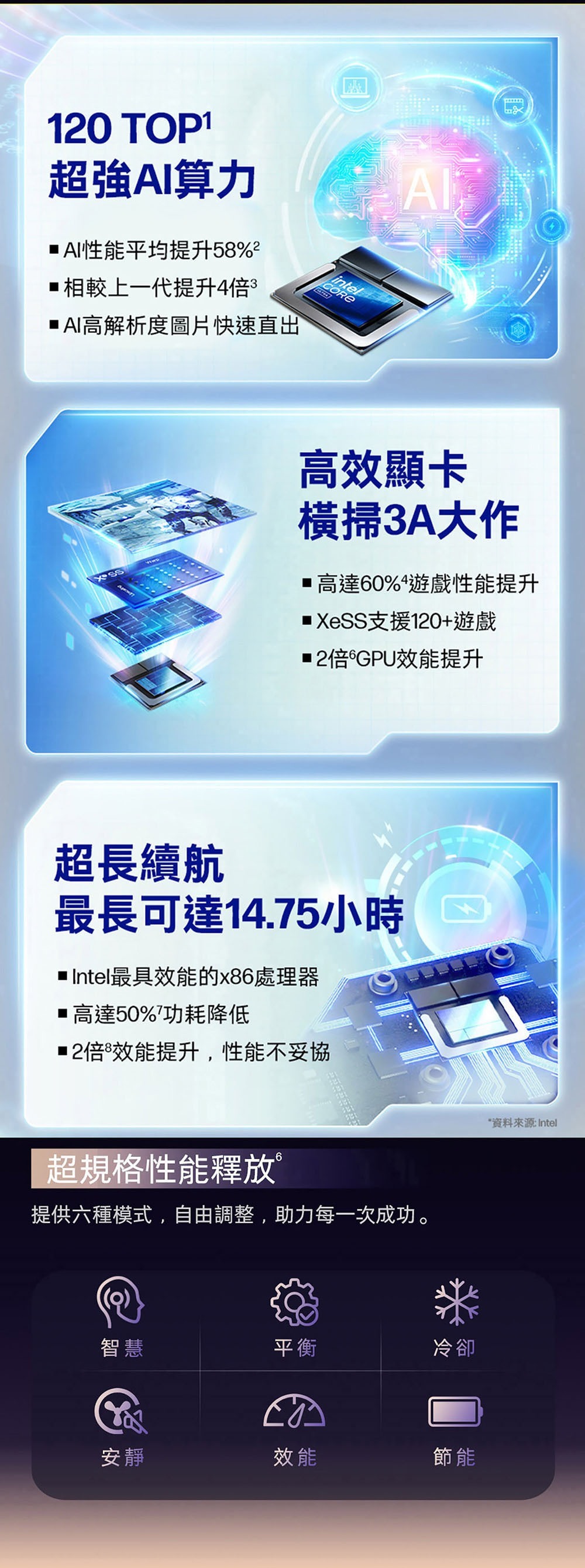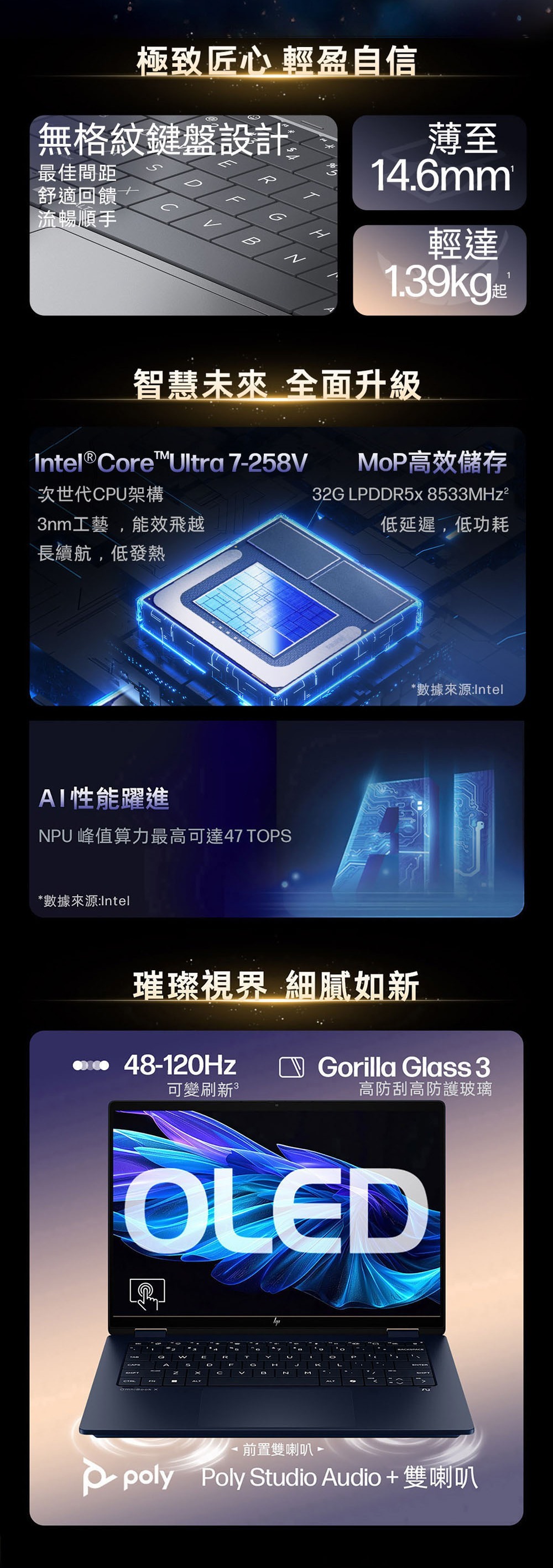 • Intel Core Ultra 7-258V, 8核心AI低功耗效能處理器, 47 NPU TOPS, 智慧效能表現進階