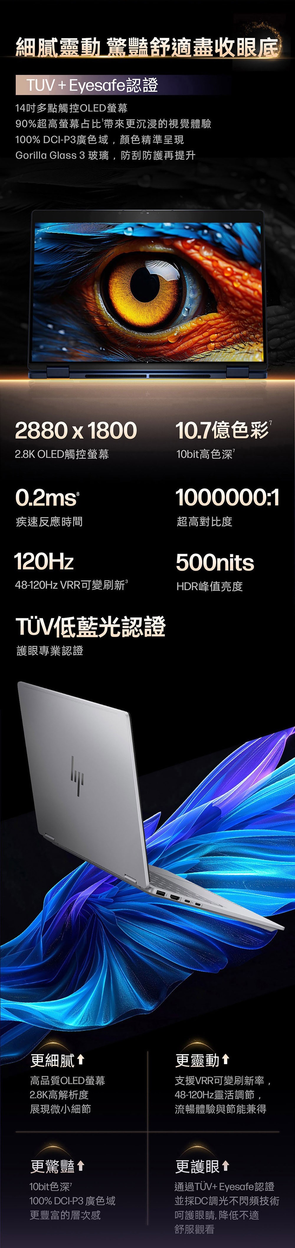 螢幕尺寸:"14""OLED2.8K(2880x1800)100%DCI-P3,400nitsinSDR/500nitsinHDR,TUV+Eyesafe,低藍光,不閃頻,VRR可變更新率48-120Hz,0.2ms反應時間"