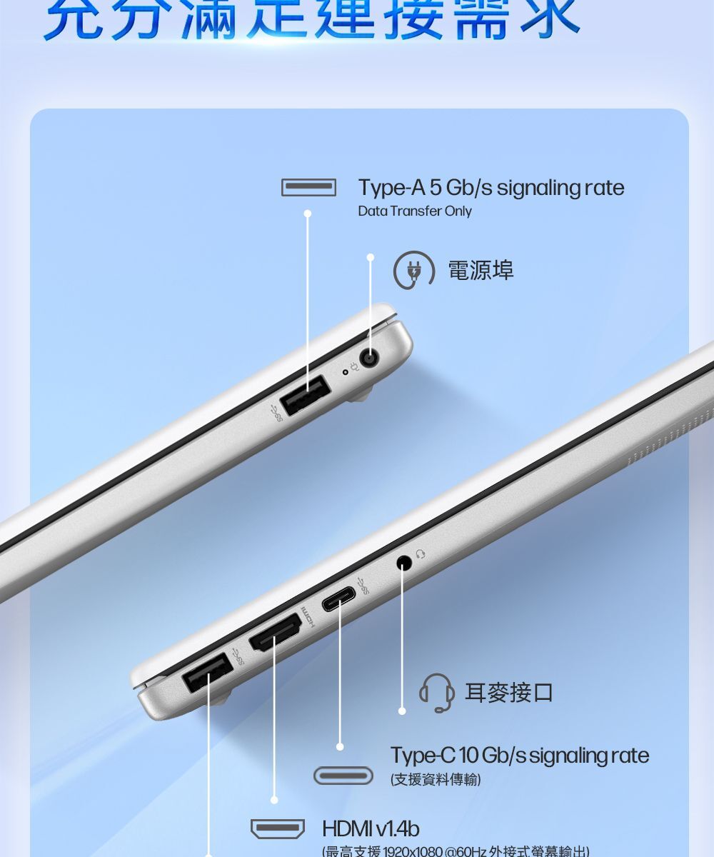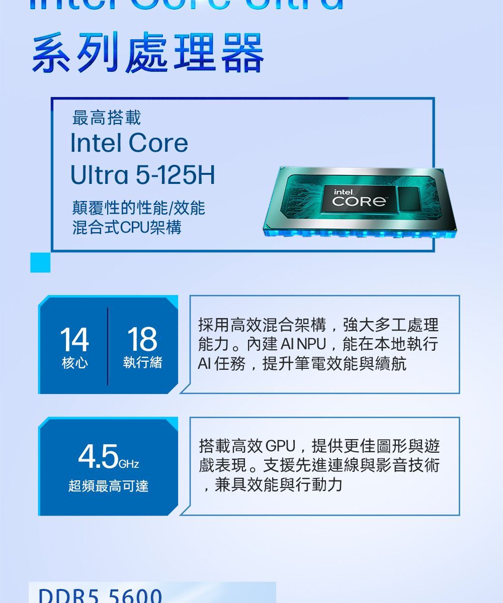 商品規格型號:Laptop 15-fd1535TU作業系統:Windows 11螢幕:15.6吋 FHD,1920x1080,IPS,16:9,霧面防眩光螢幕支援多點觸控:No處理器:Intel Core Ultra 5-125H硬碟:512 GB PCIe NVMe M.2 SSD記憶體:16GB DDR5 5600 MT/s顯示晶片:Intel Arc Graphics光碟機:無內建網路攝影機:720p True Vision TNR傳輸介面:USB 3.2 Gen 2 (3.1 Gen 2) Type-C ports quantity*1,HDMI 1.4b,電池:41 Wh 6.25 h 65 W網路通訊功能:Wi-Fi 6 (802.11ax) 2×2 + Bluetooth 5.4獨立數字鍵盤:Yes背光鍵盤:Yes指紋辨識:Yes顏色:星河銀重量:1.65kg尺寸:359.8 x 236 x 18.6 mm保固:售後保固服務第一年國際有限 (包含零件與人工)/第一年台灣本島到府收送貨源:公司貨*** 請注意:本機不含 Microsoft® Office 授權/需自行另購 ***以上規格僅供參考,若有錯誤,請以原廠官網公布為準