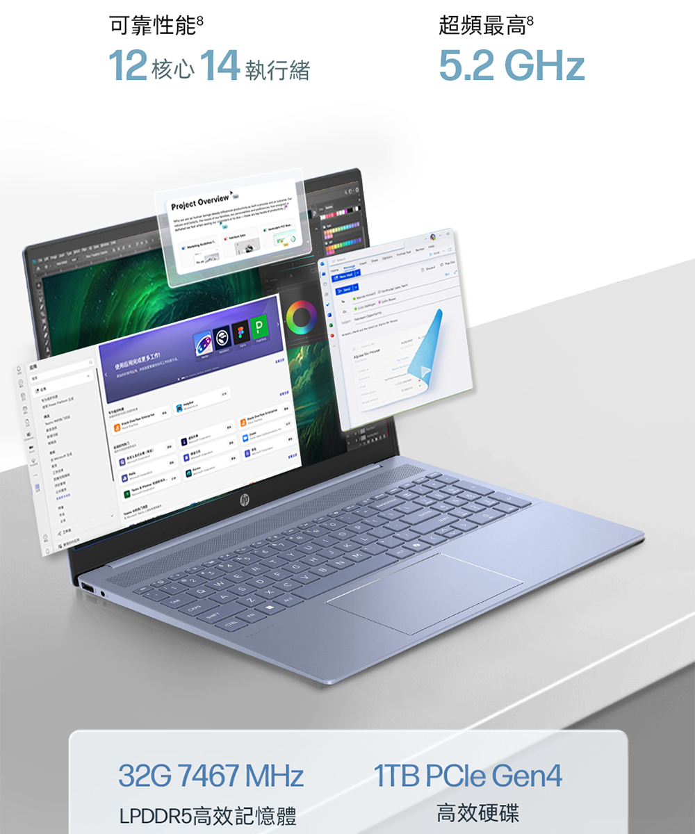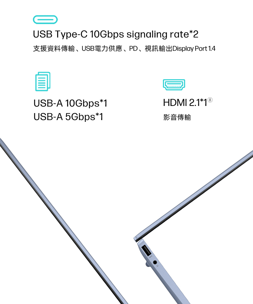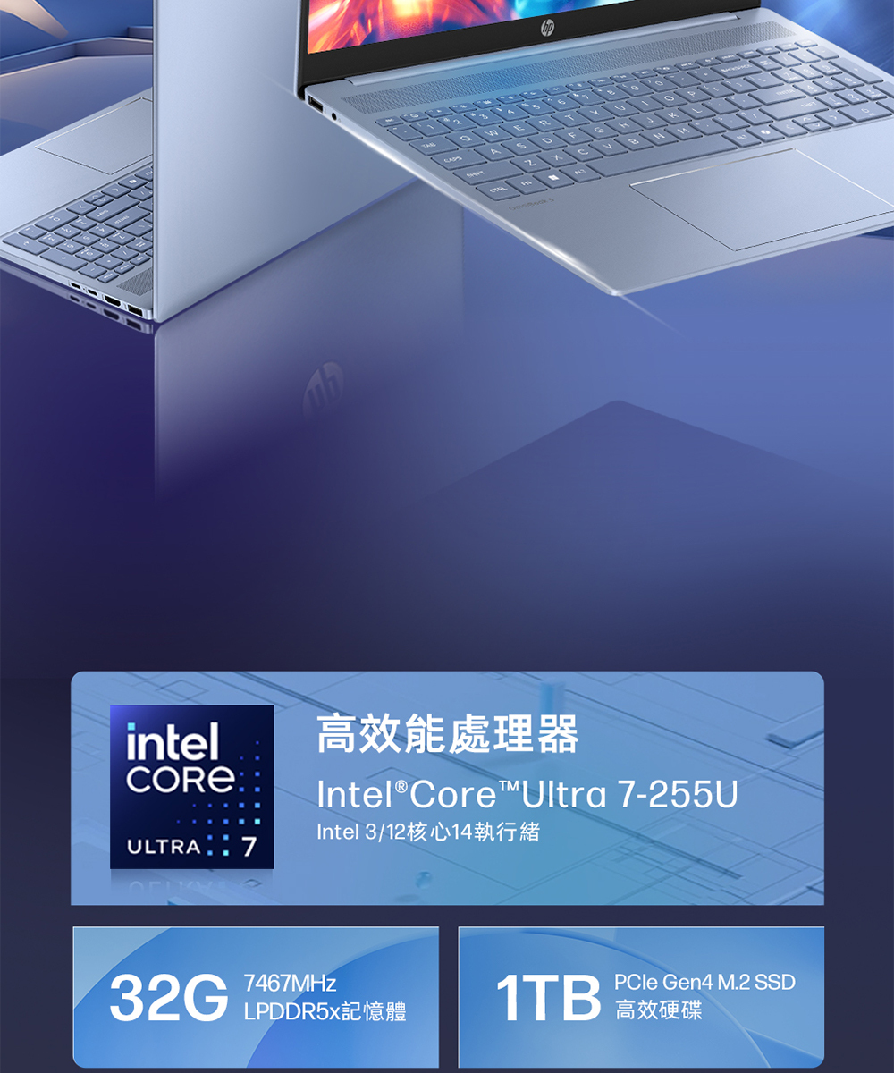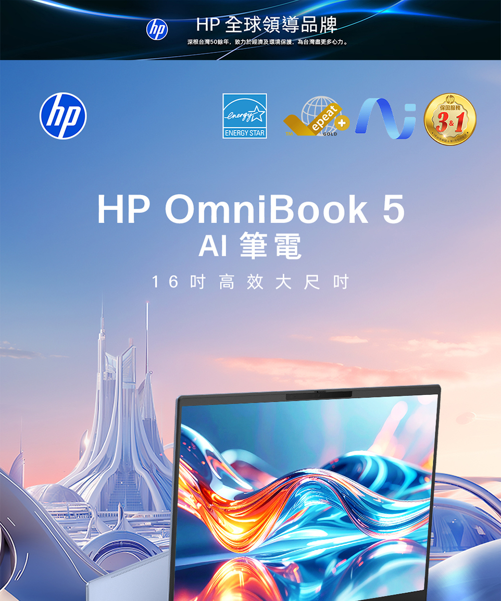 機型:HP OmniBook 5 AI 16-af1092TU處理器:Intel Core Ultra 7-255U(最高 5.1 GHz P-core Max Turbo / 4.8 GHz E-core Max Turbo;24MB L3 Cache;6 P-cores + 8 E-cores + 2 LP E-cores,16 執行緒,13 TOPS NPU)記憶體:32GB LPDDR5x-7467 MT/s(內建,無法擴充)硬碟機/轉速:1TB PCIe Gen4x4 NVMe M.2 SSD顯示晶片:Intel Graphics作業系統:Windows 11 Pro螢幕:16 吋 WUXGA (1920 x 1200) IPS 廣視角,300 nits,不閃頻,低藍光無線通訊:Wi-Fi 6 (802.11ax) 2×2 + Bluetooth 5.4網路攝影機:1080p IR Camera with TNR + 物理鏡頭開關電池:HP Long Life 3-cell 59Whr(支援 30 min 50% 快充)尺寸:35.7 x 25.4 x 1.79-1.86 cm重量:1.77 kg傳輸介面:• USB-A:1 x USB-A 10Gbps / 1 x USB-A 5Gbps• USB-C:2 x USB-C 10Gbps(支援 PD、資料傳輸、USB 電力供應與視訊輸出 DP 1.4a up to 4K@60Hz)• HDMI:HDMI 2.1(最高支援 4K @60Hz 外接顯示)• 3.5mm 耳機麥克風二合一孔● USB 埠支援 Sleep 充電(Type-C 支援)藍牙:BT 5.4喇叭/音效:Dual Speakers / DTS:X® Ultra 音效,支援 HP Audio Boost 1.0內建麥克風:雙陣列數位麥克風鍵盤:背光鍵盤(藍色)Copilot 鍵:Yes指紋辨識:No讀卡機:NoRJ-45:No支援 Miracast:Yes配件:• OmniBook 5 AI 16 主機• HP 65W Type-C Adapter