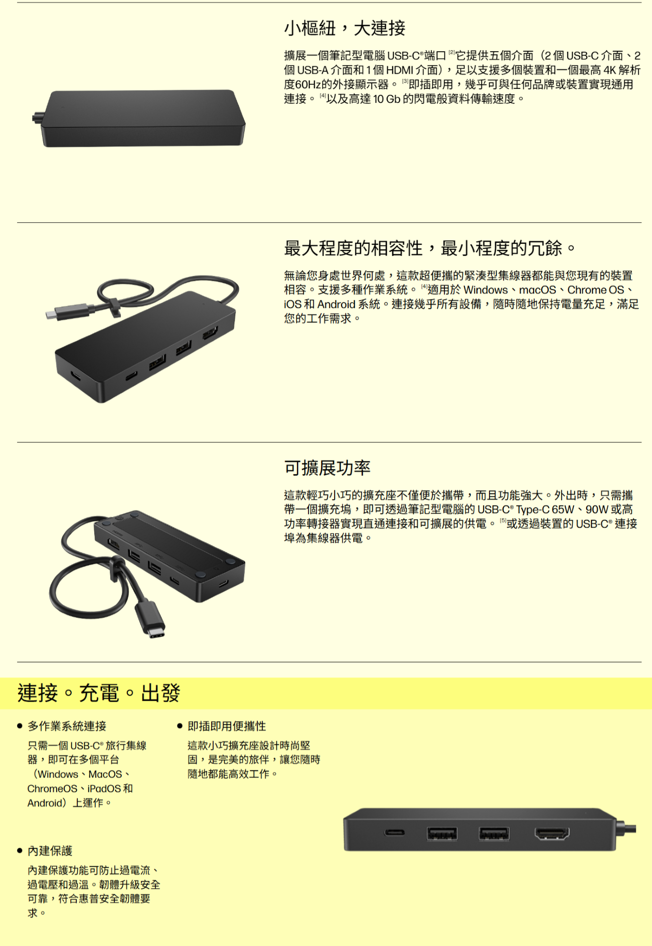 這款小巧的行動擴充座可為您的筆記型電腦增加五個重要端口,提供可擴展的電源輸出,並支援即插即用,幾乎適用於任何品牌、裝置和作業系統。