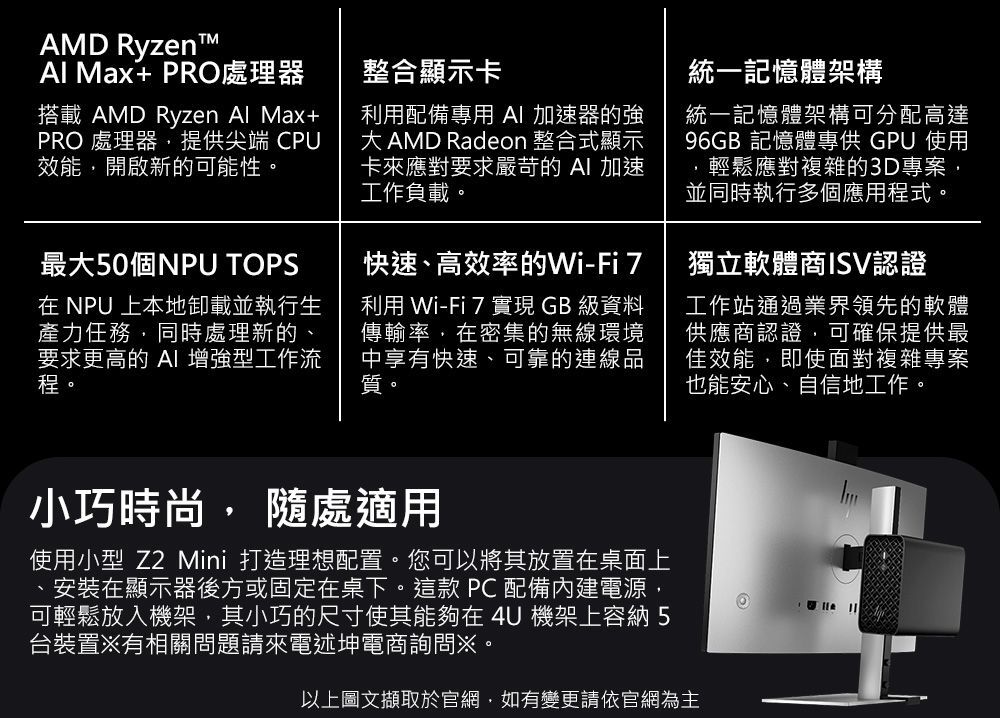 商品規格處理器:Intel Core Ultra 7 265晶片:Intel® W880 Chipset顯示卡:Intel® Graphics記憶體: 16GB (16GB x 1) DDR5 6400 nECC / 2 SODIMM slots / 128GB DDR5 6400 nECC硬碟:512GB SSD 2280 PCIe-4x4 TLC M.2光碟機: N/A電源供應器:280 W external power adapter, up to 89% average efficiency, active PFC無線網路:無線網路Intel Wi-Fi 7 +Bluetooth 5.4, non vPro作業系統:WIN 11 Pro 64bit保固:三年保固尺寸:21.1 x 21.8 x 6.9 cm側邊輸出端子:1 headphone/microphone combo1 USB-A 10Gbps port (charge port supports up to 5V/2.1A)2 USB-C® 20Gbps port (charging supported up to 5V/3A)後面板輸出端子:1 RJ-45; 2 DisplayPort 1.43 USB-A 10Gbps port1 Thunderbolt™ 3 with USB4 40Gbps port擴充插槽:1 PCI Express Gen4 slot x16 mechanical/ x8 electrical2 M.2 PCIe 4 x4 2280 (for storage)貨源:公司貨*** 請注意:本機不含 Microsoft® Office 授權/需自行另購 ***以上規格僅供參考,若有錯誤,請以原廠官網公布為準