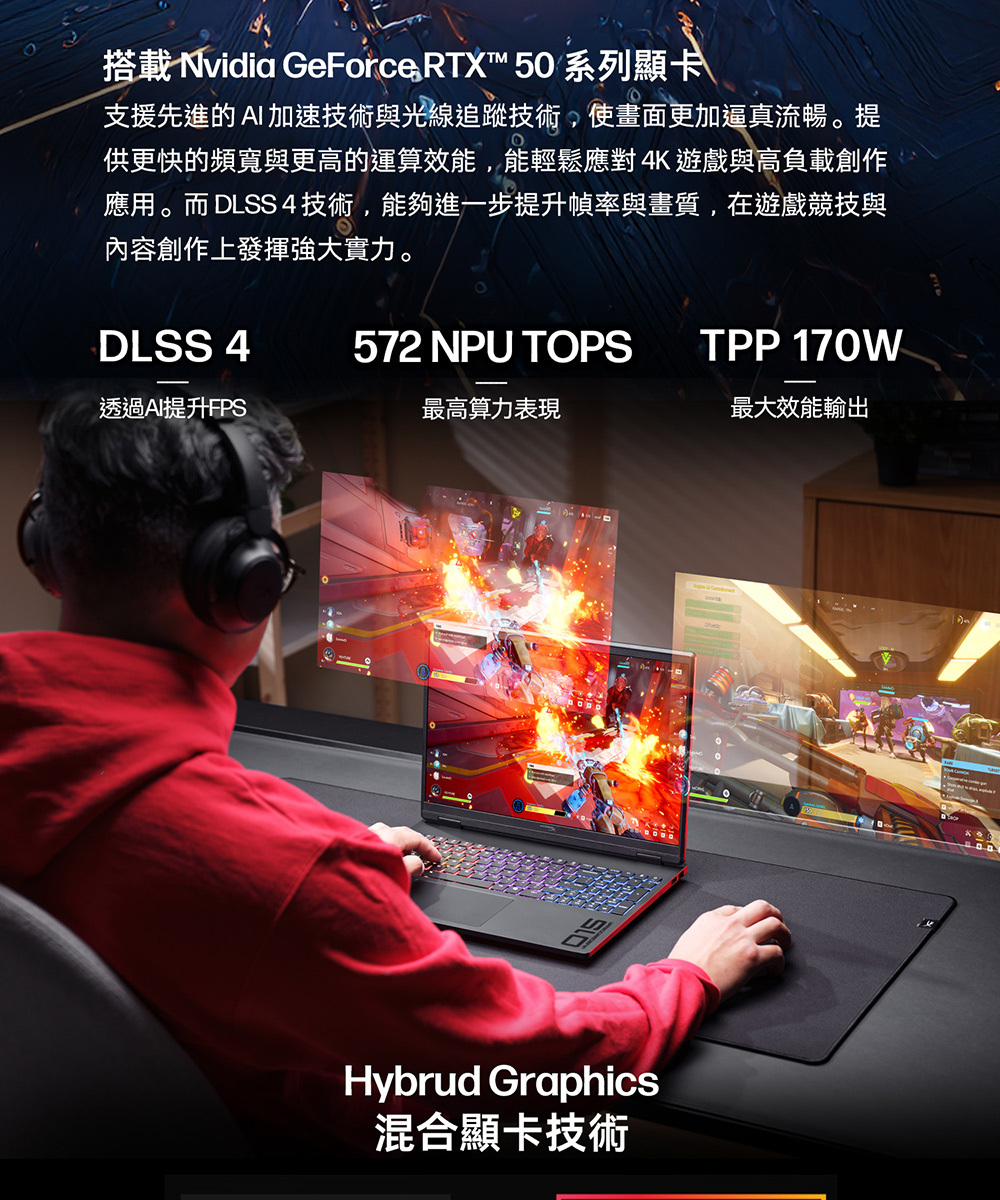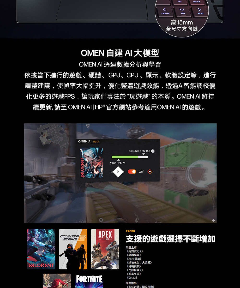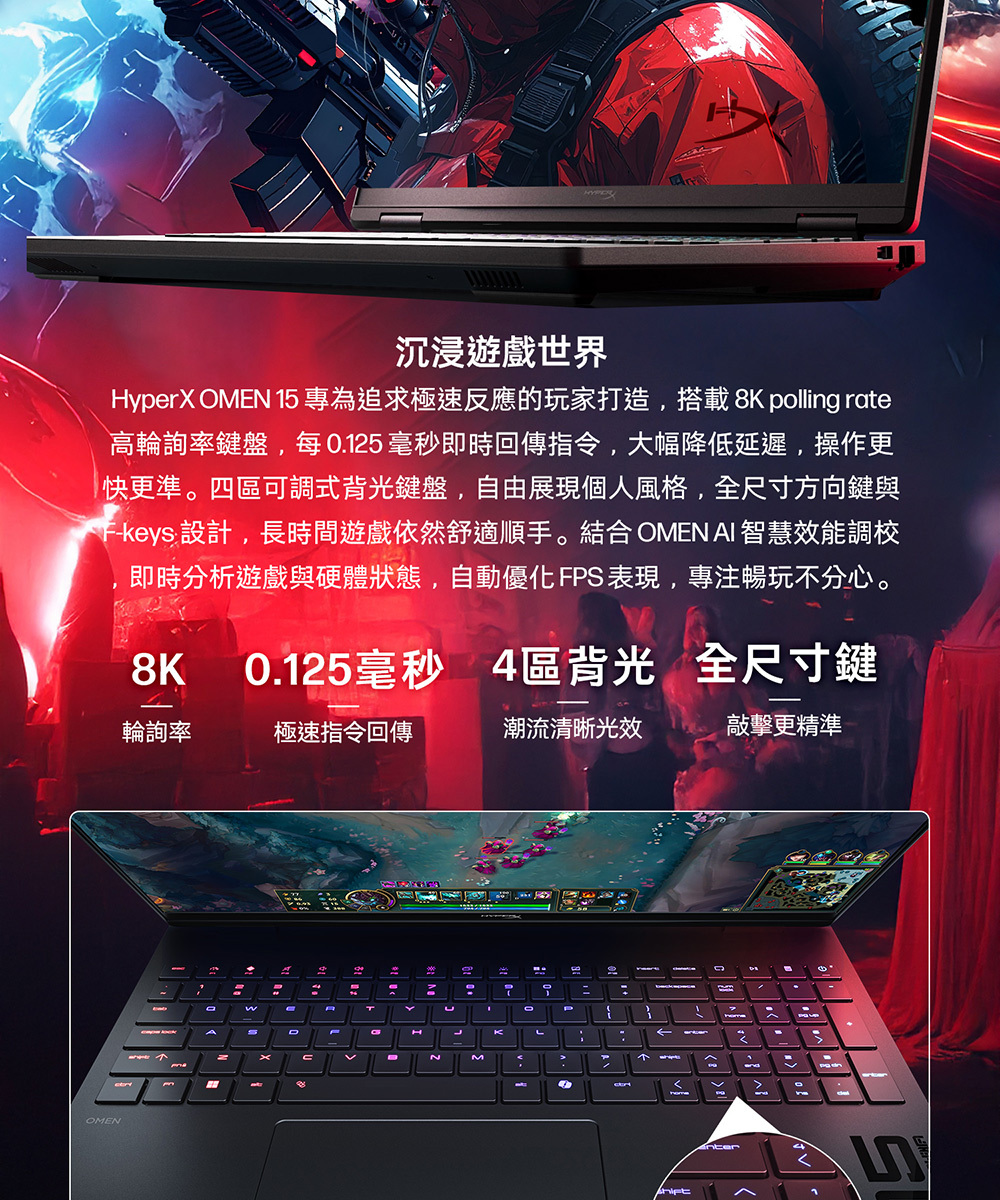 | <究極1 : 升級有感的效能表現> ◊最大TPP 170W (GPU 115W CPU 55W, 於"unleashed"釋放模式下) ◊ OMEN Gaing Hub, Fn P迅速切換使用使用模式 ◊最高RTX 5060 GPU AI 算力 572 TOPS ; 最大TGP 115W 效能輸出。透過改善的光線追蹤、AI增強的DLSS 4及NVIDIA Reflex疾速反應時間, 體現無與倫比的遊戲體驗 <究極2 : HyperX OMEN 15 散熱架構> ◊採用hyperbaric 高壓散熱設計, 增進氣流暢通 ◊採用2個12V風扇模組及158pcs風扇葉片, 讓熱氣能以更短的時間盡快排出, 以達降溫且穩定運行的目的 ◊引進風扇自清技術, 透過反向風扇運轉改變氣流方向降低灰塵堆積,自動除塵以延長使用週期, 且降低長久使用後效能的下滑 (於OGH ECO模式下將不支援) <究極3 : 實現完整的玩家體驗> ◊ 8K polling rate 高輪詢率鍵盤, 每0.125毫秒傳送一次訊號, 降低延遲、快速反應、提高準確率! ◊ 四區背光鍵盤, 個人化色彩, 展現個性與態度 ◊ 全尺吋方向箭頭按鍵與F-keys, 操作更舒適 ◊ OMEN AI : 透過數據分析與學習, 依據當下進行的遊戲、硬體、 GPU、CPU 、顯示、軟體設定等, 進行AI優調速建議, 使幀率大幅提升, 優化整體遊戲效能 ; OMEN AI 將持續更新, 透過AI智能調校優化更多的遊戲FPS, 讓玩家們專注於"玩遊戲"的本質 ◊ 採用混合式顯卡設計, 依需求追求效能或續航力 <究極4 : HyperX OMEN 15 產品設計> ◊ 低調、簡約卻不簡單的設計, 通過MIL-STD-810H 軍規測試, 高品質高耐用度 ◊ 90.64% 螢幕佔比; 16:10螢幕比例讓更多內容可以一眼即視 ◊ 165Hz VRR螢幕, 低殘影更能享受遊戲內容 ◊雙SSD槽, M.2 SSD Gen 4 Gen 5, 速度/擴充性兼俱 (出廠規格佔用一個Gen 4 SSD槽) ◊雙RAM活槽, 高擴充性 ◊完整的I/O port : 1x Type-C, 2x USB A , HDMI 2.1, RJ-45 ; 輕鬆外接及擴充 ◊ HyperX 音效, 雙喇叭結合DTS:X® Ultra音效技術, 利用遊戲數據計算出完整3D音訊,通過沉浸模式3D渲染,呈現身臨其境的環繞音效,讓遊戲感受更加震撼而逼真 ◊永續環保 : 採用消費性回收材質於筆電之設計中 ![]() ![]() ![]() ![]() ![]() ![]() ![]() ![]() ![]() ![]() ![]() ![]() ![]() ![]() |