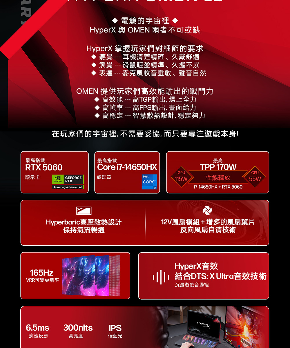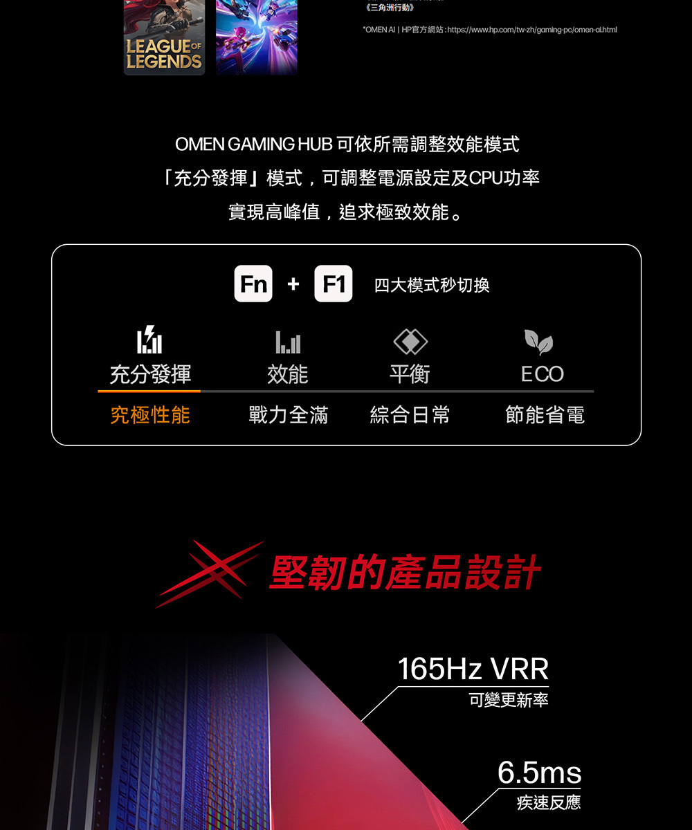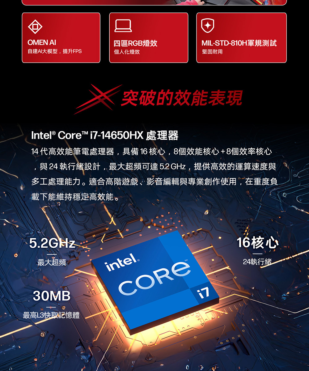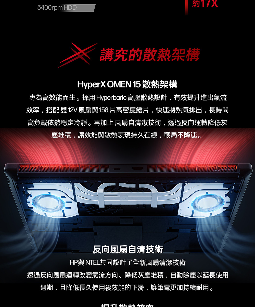 | <究極1 : 升級有感的效能表現> ◊最大TPP 170W (GPU 115W CPU 55W, 於"unleashed"釋放模式下) ◊ OMEN Gaing Hub, Fn P迅速切換使用使用模式 ◊最高RTX 5060 GPU AI 算力 572 TOPS ; 最大TGP 115W 效能輸出。透過改善的光線追蹤、AI增強的DLSS 4及NVIDIA Reflex疾速反應時間, 體現無與倫比的遊戲體驗 <究極2 : HyperX OMEN 15 散熱架構> ◊採用hyperbaric 高壓散熱設計, 增進氣流暢通 ◊採用2個12V風扇模組及158pcs風扇葉片, 讓熱氣能以更短的時間盡快排出, 以達降溫且穩定運行的目的 ◊引進風扇自清技術, 透過反向風扇運轉改變氣流方向降低灰塵堆積,自動除塵以延長使用週期, 且降低長久使用後效能的下滑 (於OGH ECO模式下將不支援) <究極3 : 實現完整的玩家體驗> ◊ 8K polling rate 高輪詢率鍵盤, 每0.125毫秒傳送一次訊號, 降低延遲、快速反應、提高準確率! ◊ 四區背光鍵盤, 個人化色彩, 展現個性與態度 ◊ 全尺吋方向箭頭按鍵與F-keys, 操作更舒適 ◊ OMEN AI : 透過數據分析與學習, 依據當下進行的遊戲、硬體、 GPU、CPU 、顯示、軟體設定等, 進行AI優調速建議, 使幀率大幅提升, 優化整體遊戲效能 ; OMEN AI 將持續更新, 透過AI智能調校優化更多的遊戲FPS, 讓玩家們專注於"玩遊戲"的本質 ◊ 採用混合式顯卡設計, 依需求追求效能或續航力 <究極4 : HyperX OMEN 15 產品設計> ◊ 低調、簡約卻不簡單的設計, 通過MIL-STD-810H 軍規測試, 高品質高耐用度 ◊ 90.64% 螢幕佔比; 16:10螢幕比例讓更多內容可以一眼即視 ◊ 165Hz VRR螢幕, 低殘影更能享受遊戲內容 ◊雙SSD槽, M.2 SSD Gen 4 Gen 5, 速度/擴充性兼俱 (出廠規格佔用一個Gen 4 SSD槽) ◊雙RAM活槽, 高擴充性 ◊完整的I/O port : 1x Type-C, 2x USB A , HDMI 2.1, RJ-45 ; 輕鬆外接及擴充 ◊ HyperX 音效, 雙喇叭結合DTS:X® Ultra音效技術, 利用遊戲數據計算出完整3D音訊,通過沉浸模式3D渲染,呈現身臨其境的環繞音效,讓遊戲感受更加震撼而逼真 ◊永續環保 : 採用消費性回收材質於筆電之設計中 ![]() ![]() ![]() ![]() ![]() ![]() ![]() ![]() ![]() ![]() ![]() ![]() ![]() ![]() |