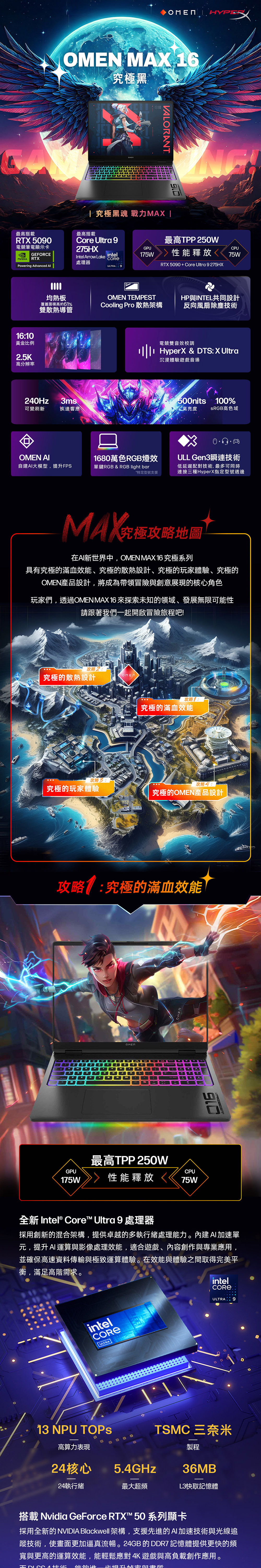 處理器:Intel® Core™ Ultra 9 275HX TSMC N3B / 24核心(8P+16E), 24執行緒 / TDP 55W / 13 NPU TOPs (2.7GHz, turbo 5.4GHz, 36MB L3 cache)