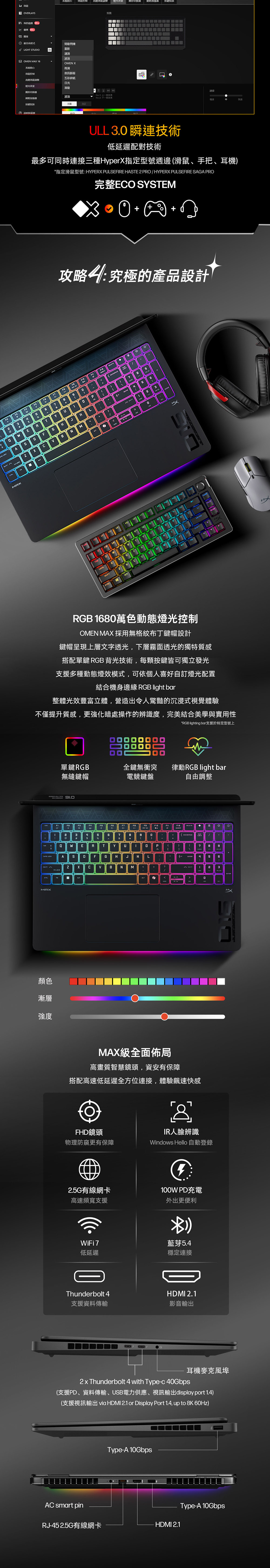 ◊ 金屬A/D蓋, 低調、簡約的設計 ; 鍵盤單鍵RGB, C面下緣RGB燈效, 1680萬燈光色彩選擇, 支援個人化設定帶出自我風格