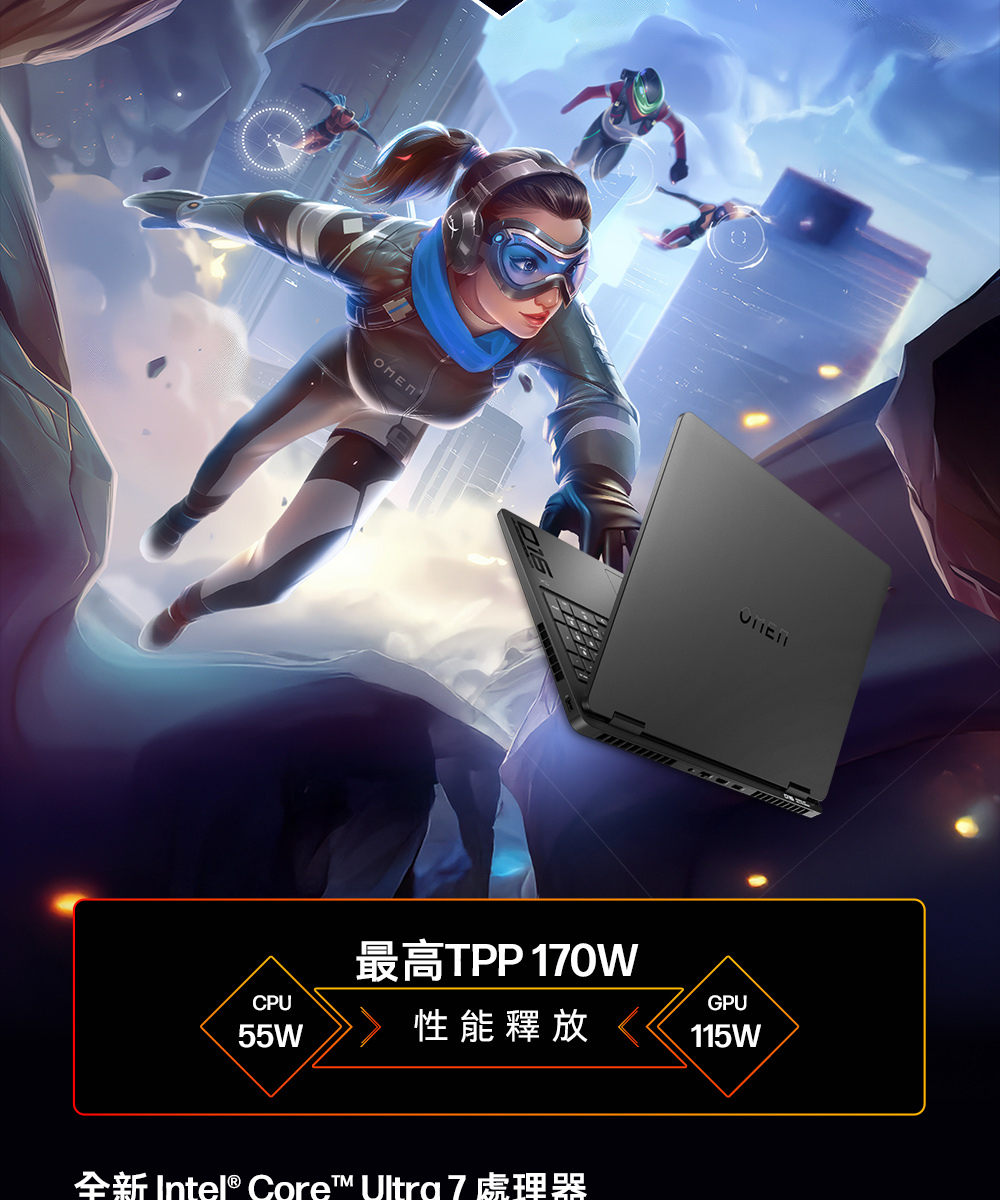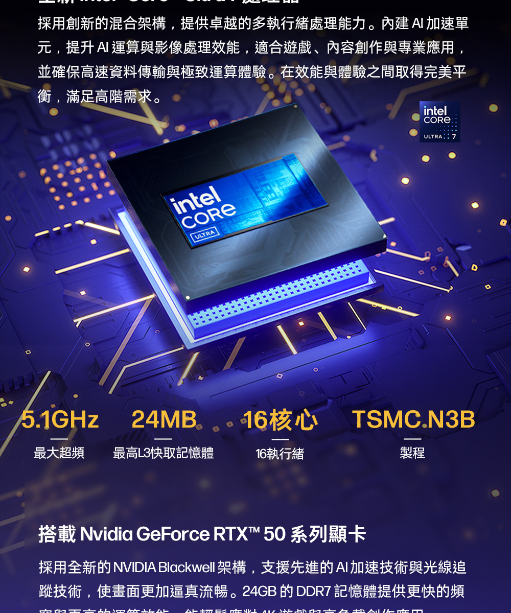 處理器:Intel Core Ultra 7 255H(2.0GHz up to 5.1GHz / 16核心 / 16執行緒 / 24MB L3 Cache / 13 NPU TOPs)