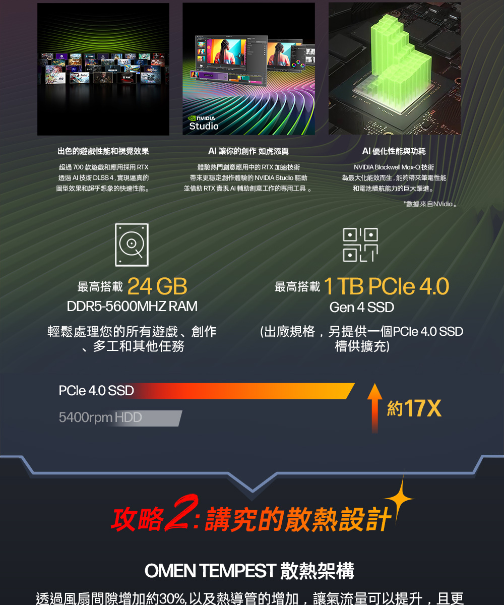 硬碟機/轉速:1TB PCIe Gen4 NVMe M.2 SSD(另有1槽可擴充)