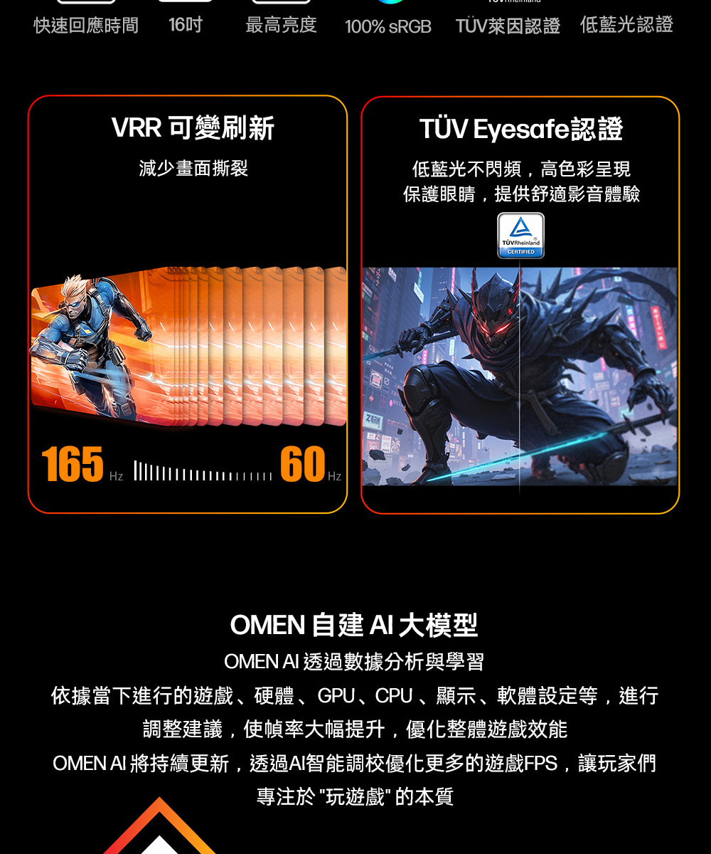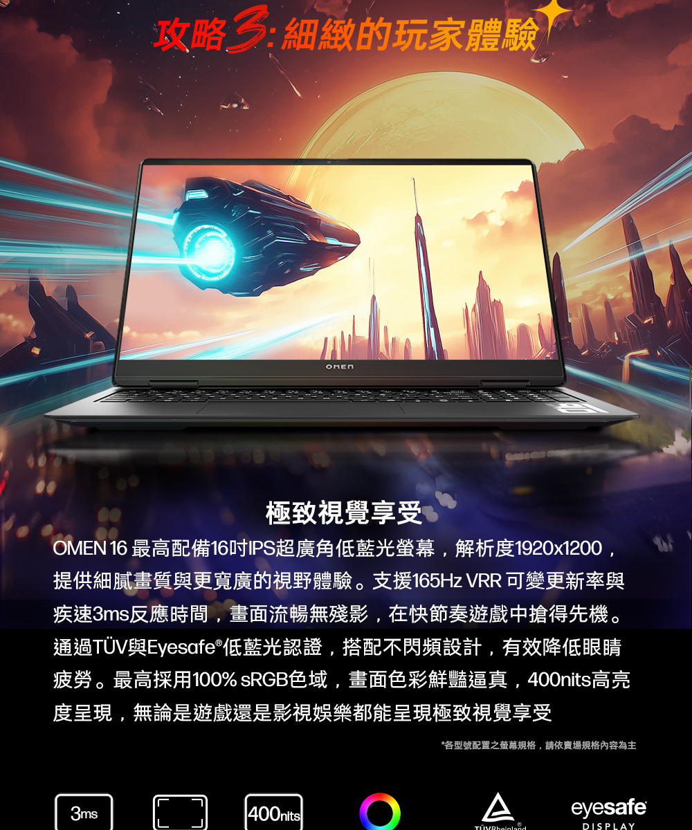螢幕:16 吋 WUXGA (1920 x 1200) IPS 霧面 / 165Hz / 3ms / 400 nits / 100% sRGB / 16:10 / 低藍光 / 不閃頻