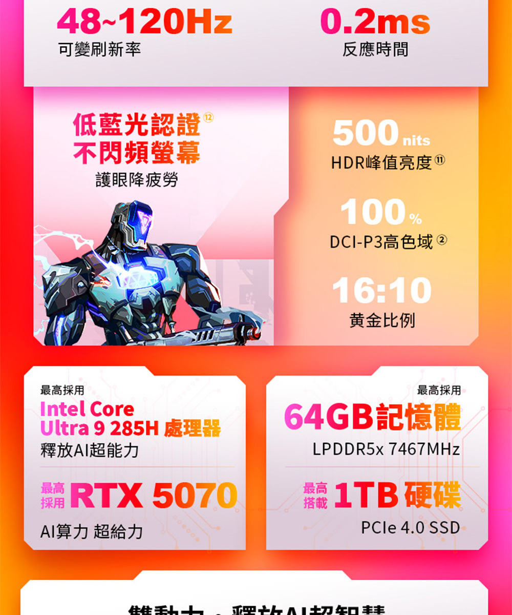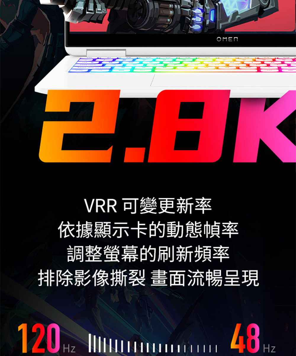 ◊ 2.8K 120Hz VRR螢幕, 畫面色彩表現、細膩畫質、低殘影, 更能享受遊戲內容