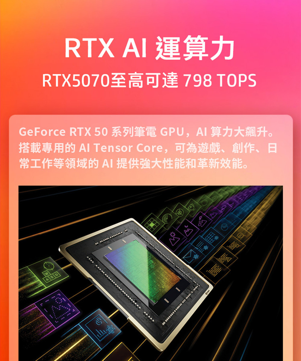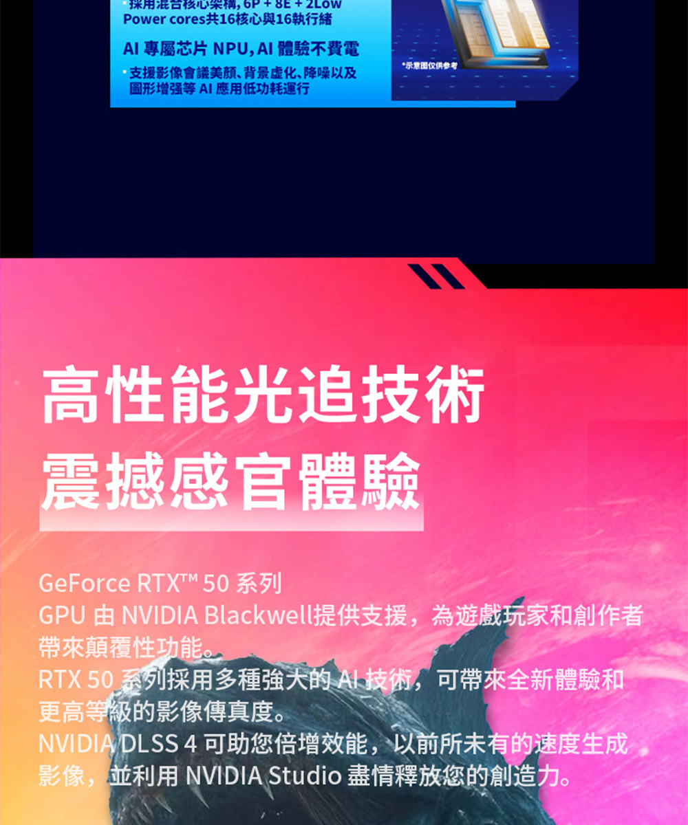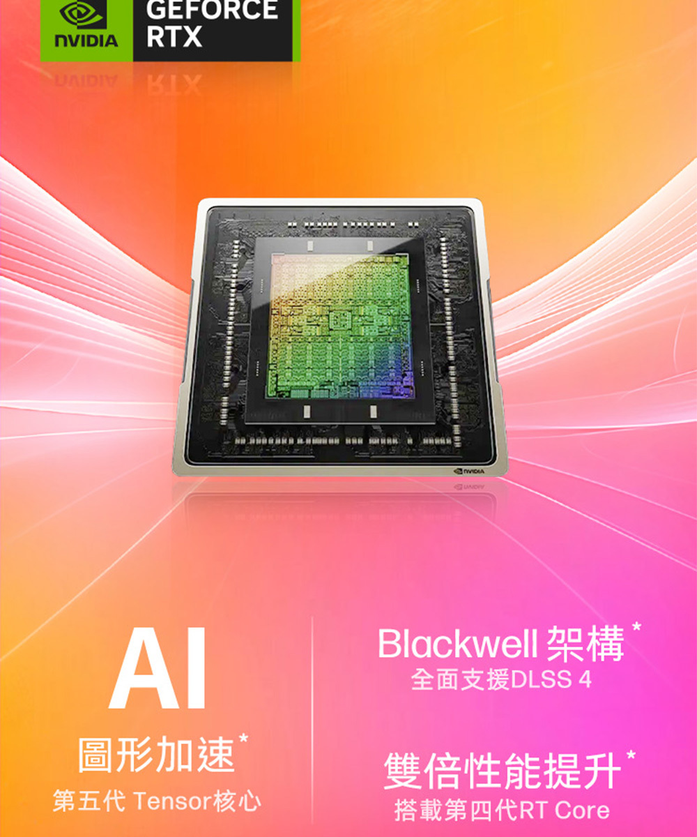 ◊ 最高RTX 5060 GPU AI 算力 572 TOPS ; 透過改善的光線追蹤、AI增強的DLSS 4及NVIDIA Reflex疾速反應時間, 體現無與倫比的遊戲體驗