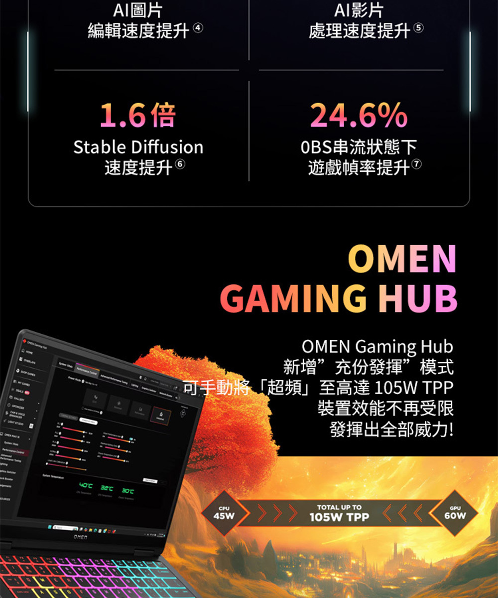◊ OMEN AI : 透過數據分析與學習, 依據當下進行的遊戲、硬體、 GPU、CPU 、顯示、軟體設定等, 進行AI優調速建議, 使幀率大幅提升, 優化整體遊戲效能