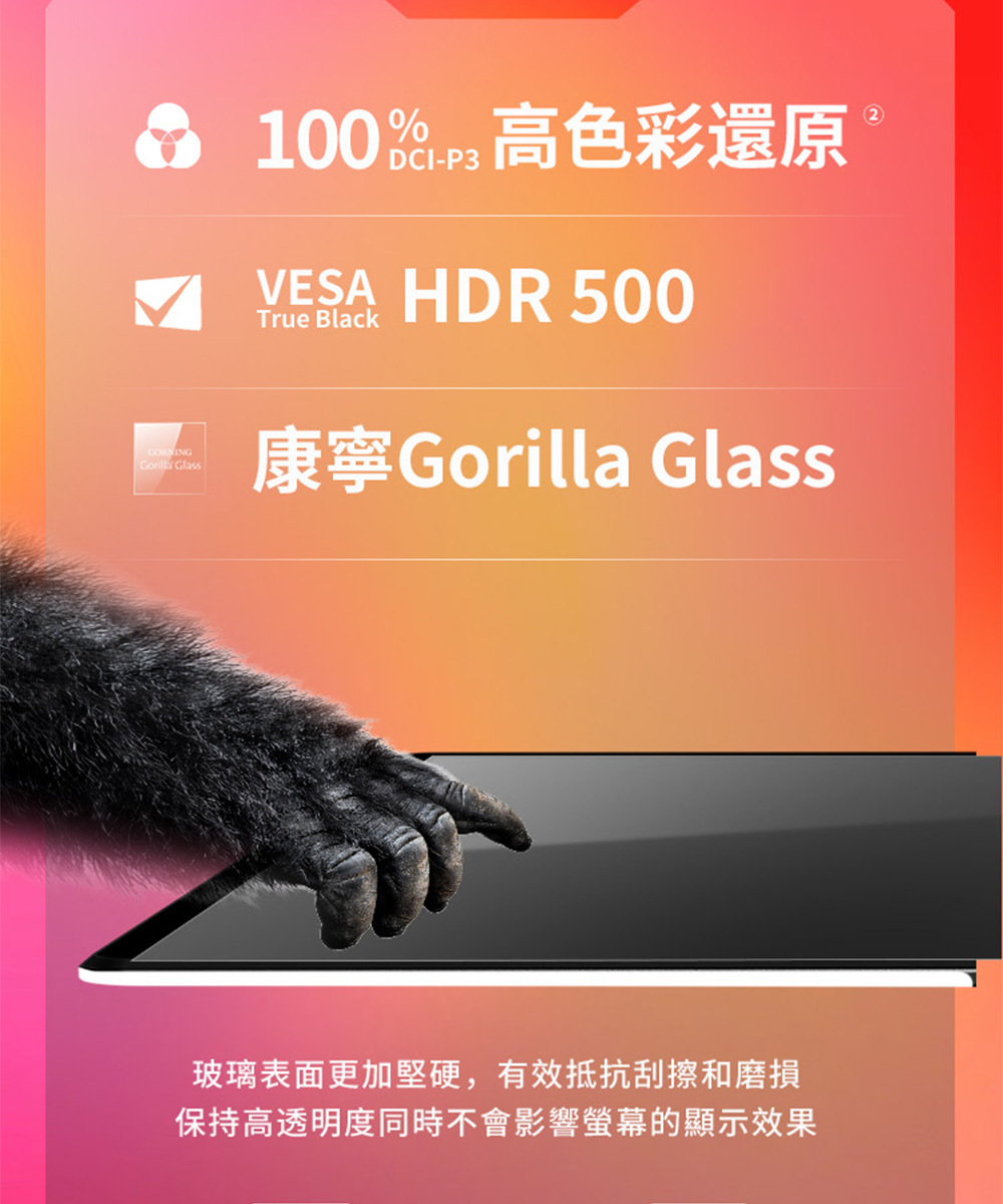 100% DCI-P3 / SDR 400nits / HDR 500nits / 0.2ms